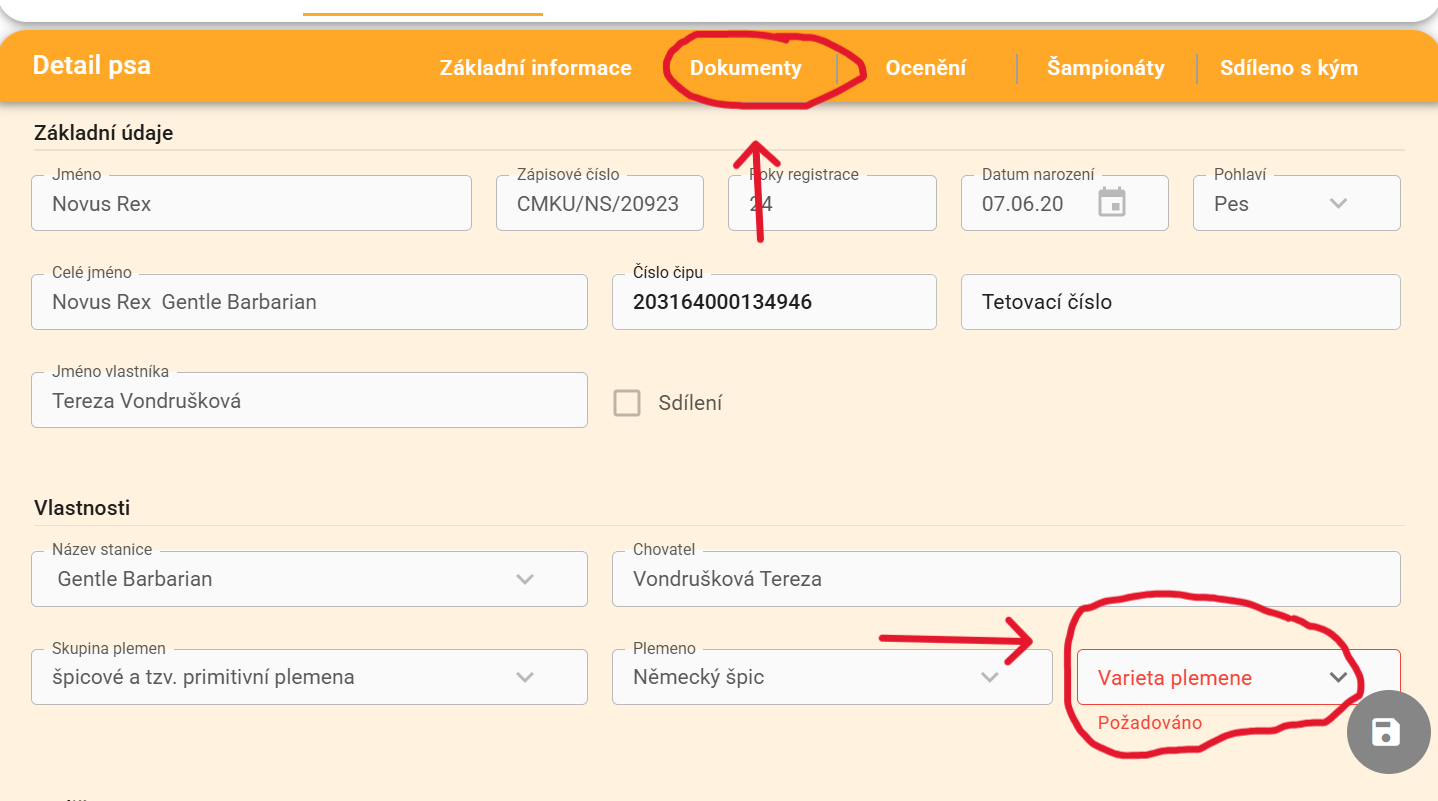 5) PEJSKA JSTE POTVRDILI A OTEVŘETE SI JEHO PROFIL V MÝCH PSECH, DALŠÍM KROKEM JE VYPLNĚNÍ VARIANTY PLEMENE (ráz a barva) A NAHRÁNÍ KOPIE PRŮKAZU PŮVODU, pokud máte štěňátko a ještě jste neobdrželi průkaz původu, lze nahrát buď žádanku k zápisu štěňat nebo vzor rodokmenu - po domluvě s chovatelem, při nejhorším scan z pet pasu s poznámkou, že rodokmen ještě nemáte. Pozor, až jej obdržíte, myslete na to a nahrajte originál!