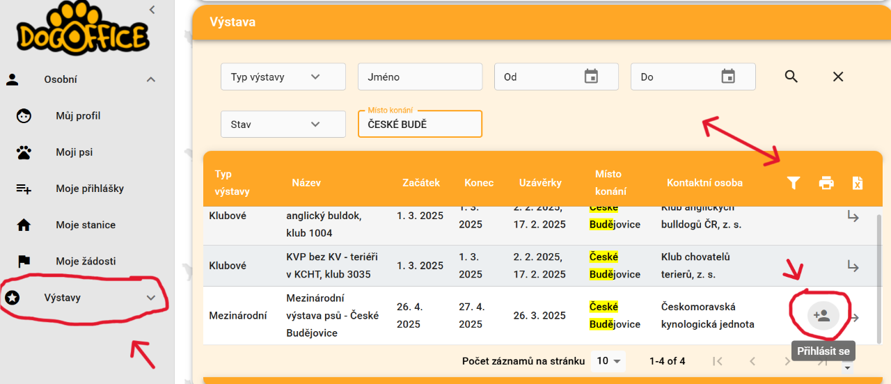 Ve výstavách naleznete seznam všech výstav, lze si otevřít filtr pro snadnější hledání - typ výstav, datum, město. Pak přihlásit, to už není složité, následně výstavu zaplatit a případně nahrát doklad o platbě, to už vše naleznete v horním menu vedle MOJI PSI - MOJE PŘIHLÁŠKY.
